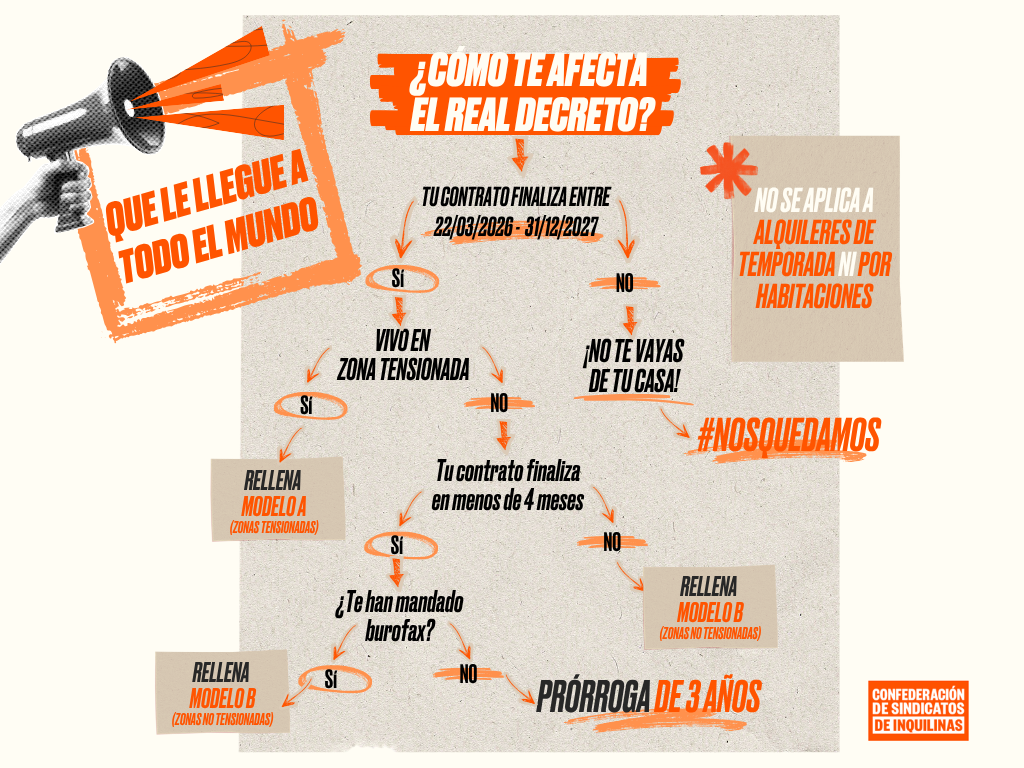 El Real Decreto sólo cubre los contratos que se terminen dentro del periodo de 22 de marzo de 2026 al 31 diciembre de 2027. Si tu contrato vence antes o más tarde, igualmente lo vamos a luchar contigo. Recuerda que el casero te tiene que avisar con 4 meses de antelación en caso de que no quiera renovar. Para estar preparada, afíliate y vente al Sindicato. La organización colectiva permite negociar, frenar subidas abusivas y aplicar la estrategia #NosQuedamos.